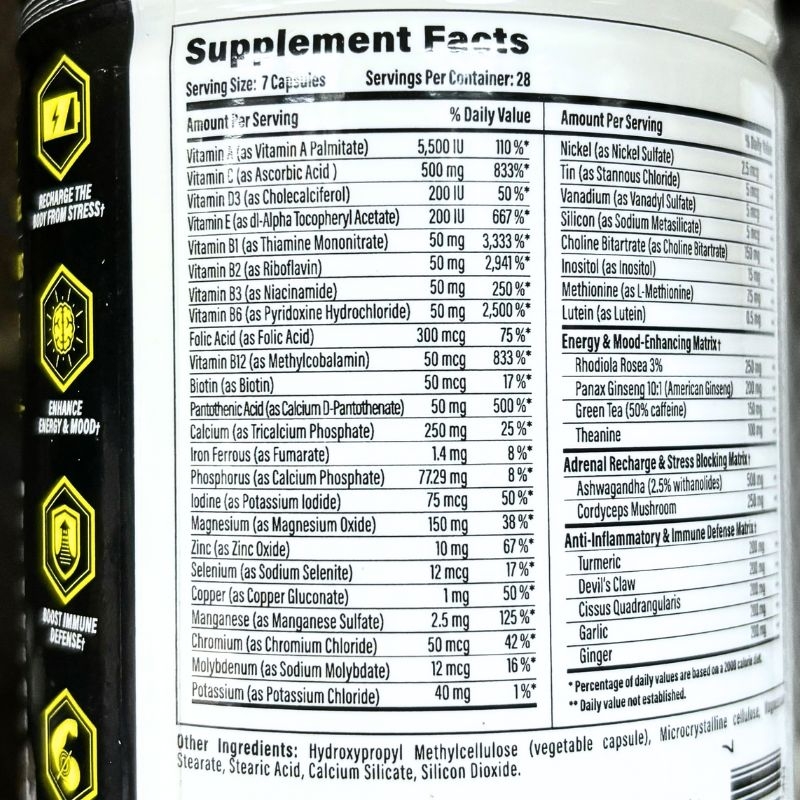 500mg Ashwaganda (2,5% withanolides) - Hoạt chất tự nhiên này có tác dụng giảm căng thẳng và giảm nồng độ cortisol, đồng thời nạp lại năng lượng cho tuyến thượng thận. Nó cũng kích thích hệ thống miễn dịch và được chứng minh là giúp giảm viêm.
